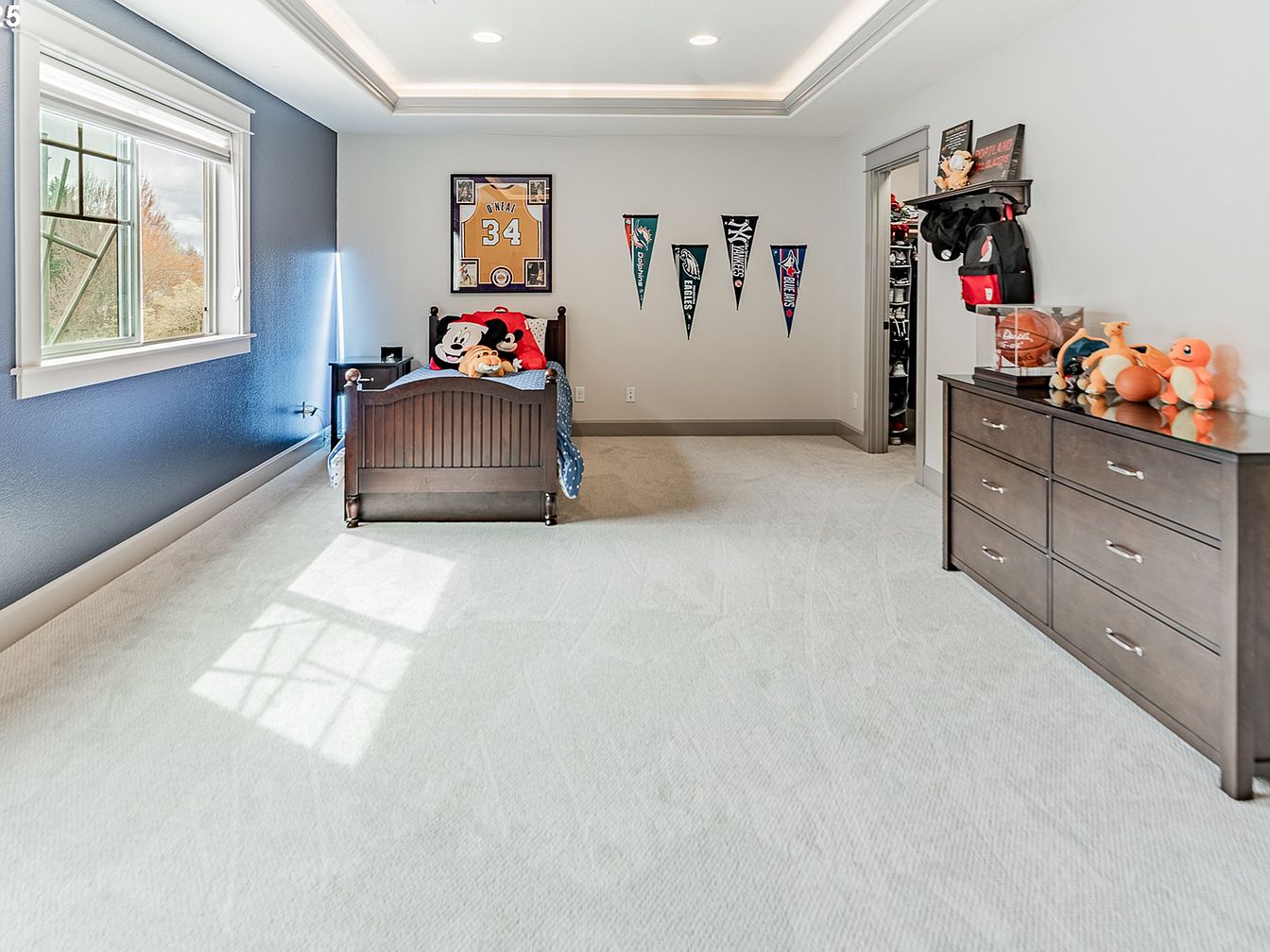 This bright and spacious child’s bedroom combines a soothing mix of navy blue and light gray walls with soft, plush white carpeting that adds warmth to the space. The dark wood bed features playful stuffed toys including Mickey Mouse, emphasizing a youthful vibe. A framed sports jersey and four colorful pennants decorate the wall, reflecting the occupant’s interest in sports. A large window with white trim allows natural light to flood the room, enhancing its airy feel. A dark wood dresser topped with basketball memorabilia and plush toys offers ample storage, while a small shelf by the closet doorway holds backpacks, blending functionality with personal touches.