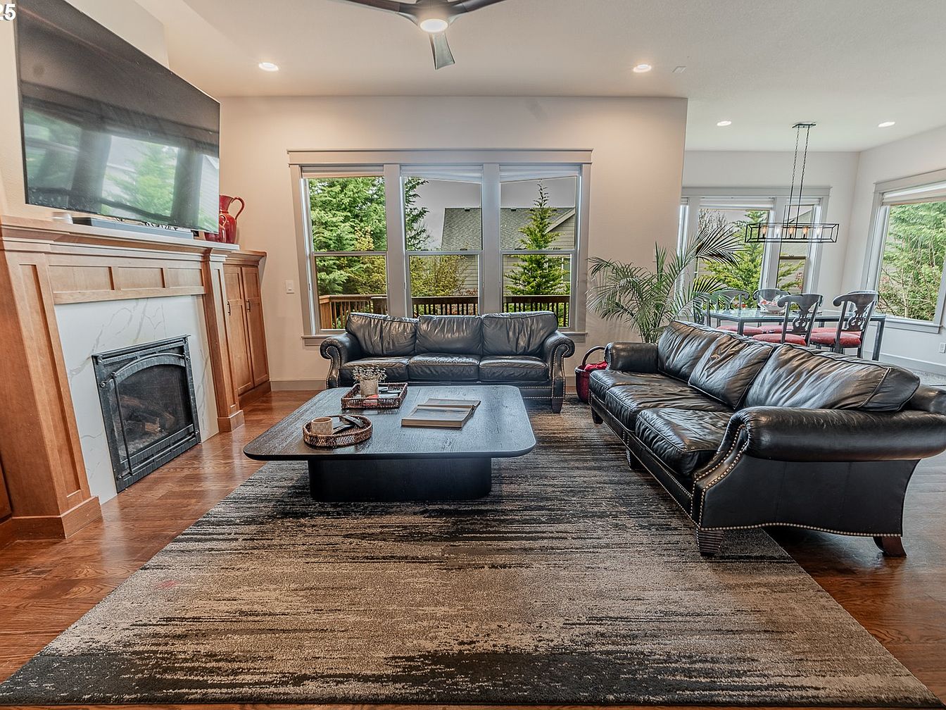 This spacious living room blends comfort and style with two black leather sofas centered around a low dark wood coffee table atop a large neutral-toned area rug featuring subtle gradient patterns. The seating area faces a wooden fireplace mantel with a white marble surround, topped by a mounted flat-screen TV, creating a cozy focal point. Large windows behind the sofas flood the room with natural light, providing a picturesque view of greenery outside. Warm wooden flooring complements the mantel’s rich finish, while touches of greenery in planters add freshness. The open layout leads into a bright dining nook, tying the spaces together seamlessly.