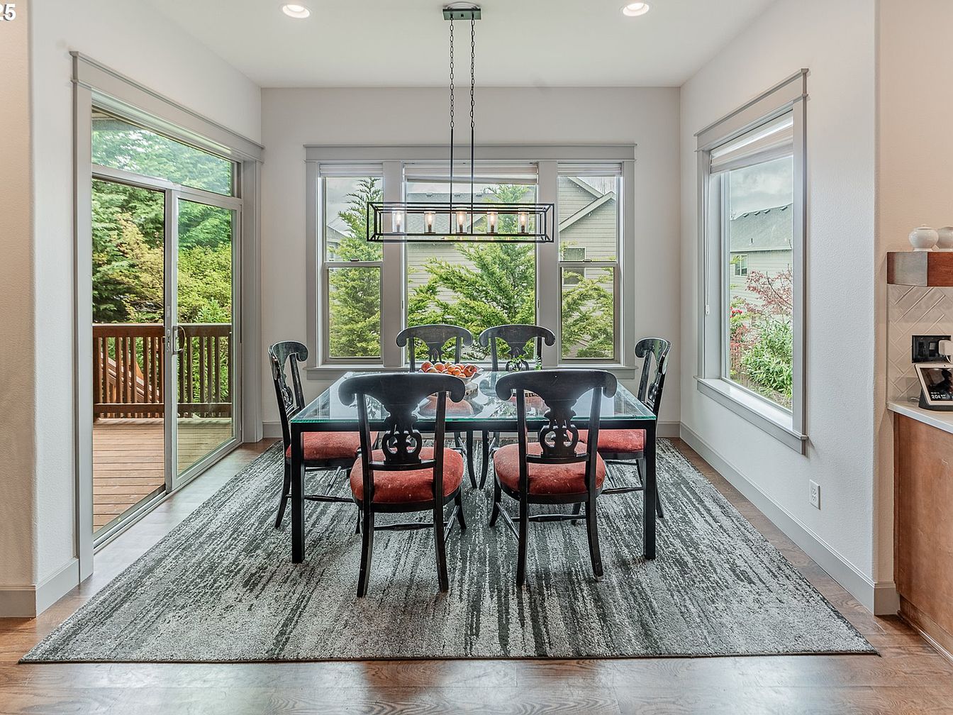 This dining area features a clean and contemporary layout accentuated by large windows that let in ample natural light and provide a lush garden view. A rectangular glass-top table sits on a textured gray area rug, surrounded by six black chairs with intricate wooden backs and deep red upholstered seats, adding a pop of color. The walls and window trims are painted white and light gray, creating a fresh and airy ambiance. A modern rectangular pendant light with multiple bulbs hangs above the table, enhancing both functionality and style. Sliding glass doors open to a wooden deck, seamlessly blending indoor and outdoor living.