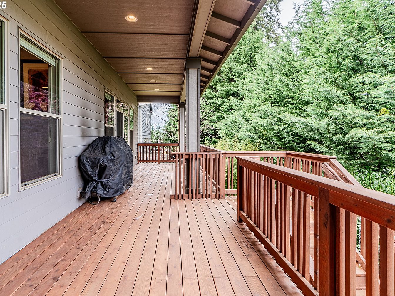 This covered wooden deck features warm-toned wood planks that blend naturally with the surrounding lush greenery, creating a harmonious outdoor living space. The reddish-brown railing provides safety and architectural interest, while the ceiling is finished in a neutral tone with recessed lighting for evening ambiance. Large windows along the house exterior offer views and connect interior spaces with the outside. A covered grill with a black protective cover suggests this space is ideal for outdoor cooking and entertaining. The balcony extends lengthwise, providing ample room for relaxation while surrounded by nature.