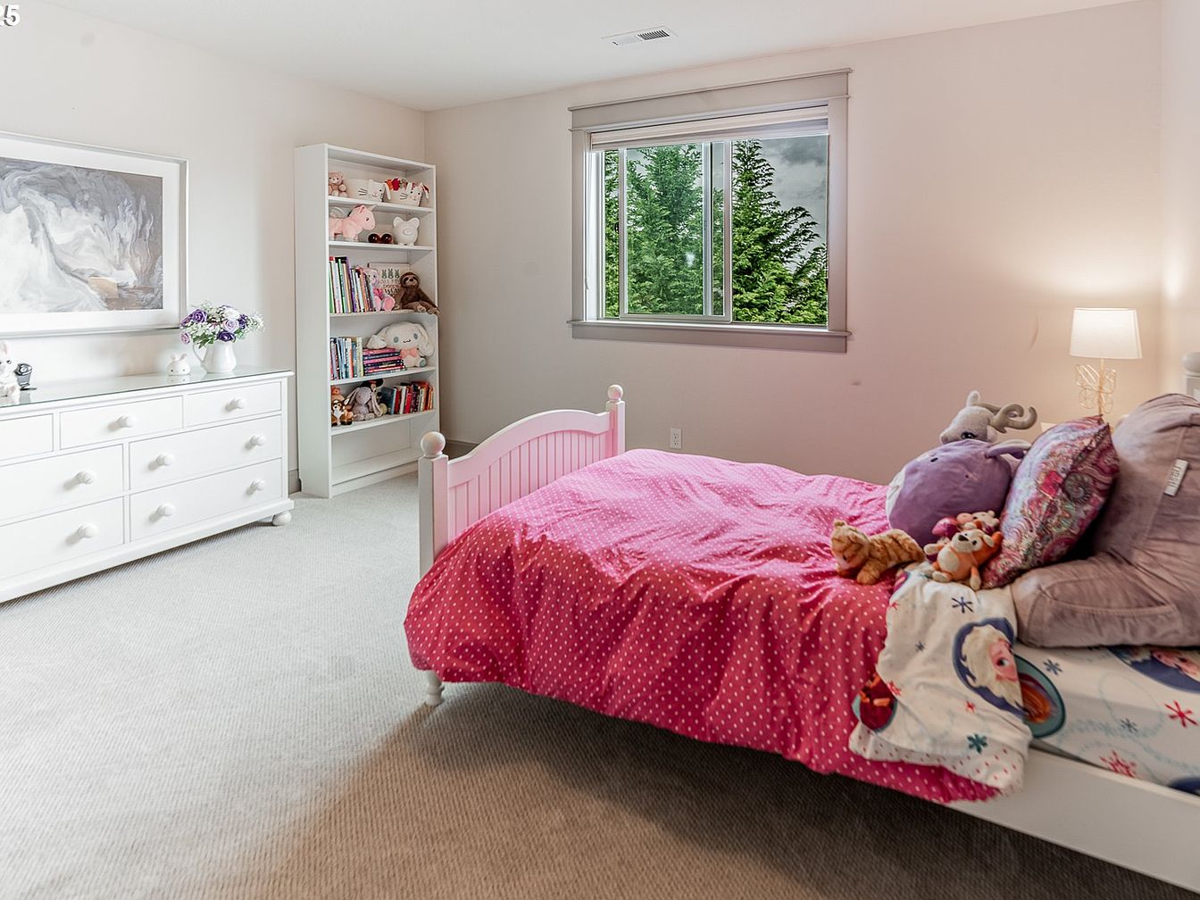This cozy children’s bedroom features a soft, neutral palette with white walls and light gray carpeting, creating a bright and calming atmosphere. A white wooden bed with rounded finials is dressed with a playful pink polka-dot comforter and an assortment of plush toys and patterned pillows, adding warmth and personality. To the left, a white dresser with classic knobs holds decorative items and a vase of flowers, while an adjacent white bookshelf displays a collection of books and stuffed animals, enhancing the room’s inviting and child-friendly appeal. A large window brings in natural light and offers a view of lush greenery outside.