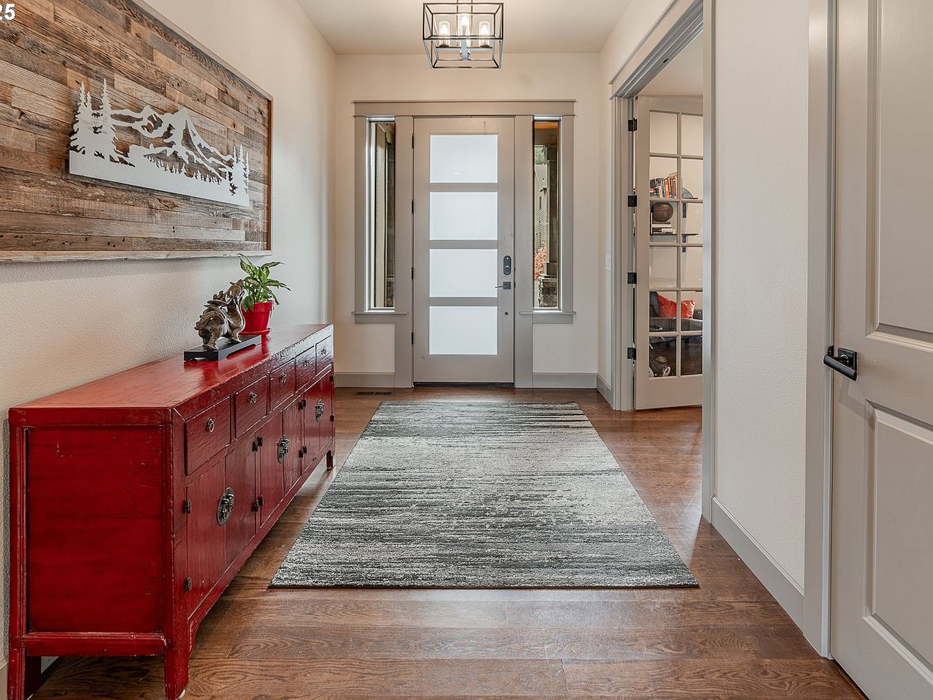 This entryway features warm, medium-toned hardwood flooring and soft beige walls accented by neutral gray trim. A modern, frosted glass front door flanked by narrow windows allows natural light to gently filter in, brightening the space. The focal point is a striking vintage-inspired red wooden sideboard with multiple compartments, adding a bold pop of color and ample storage. Above it hangs a rustic wooden wall art piece with a nature scene cutout, enhancing the welcoming feel. A subtle gradient gray area rug centers the hallway, complementing the overall harmonious blend of rustic charm and contemporary design elements.