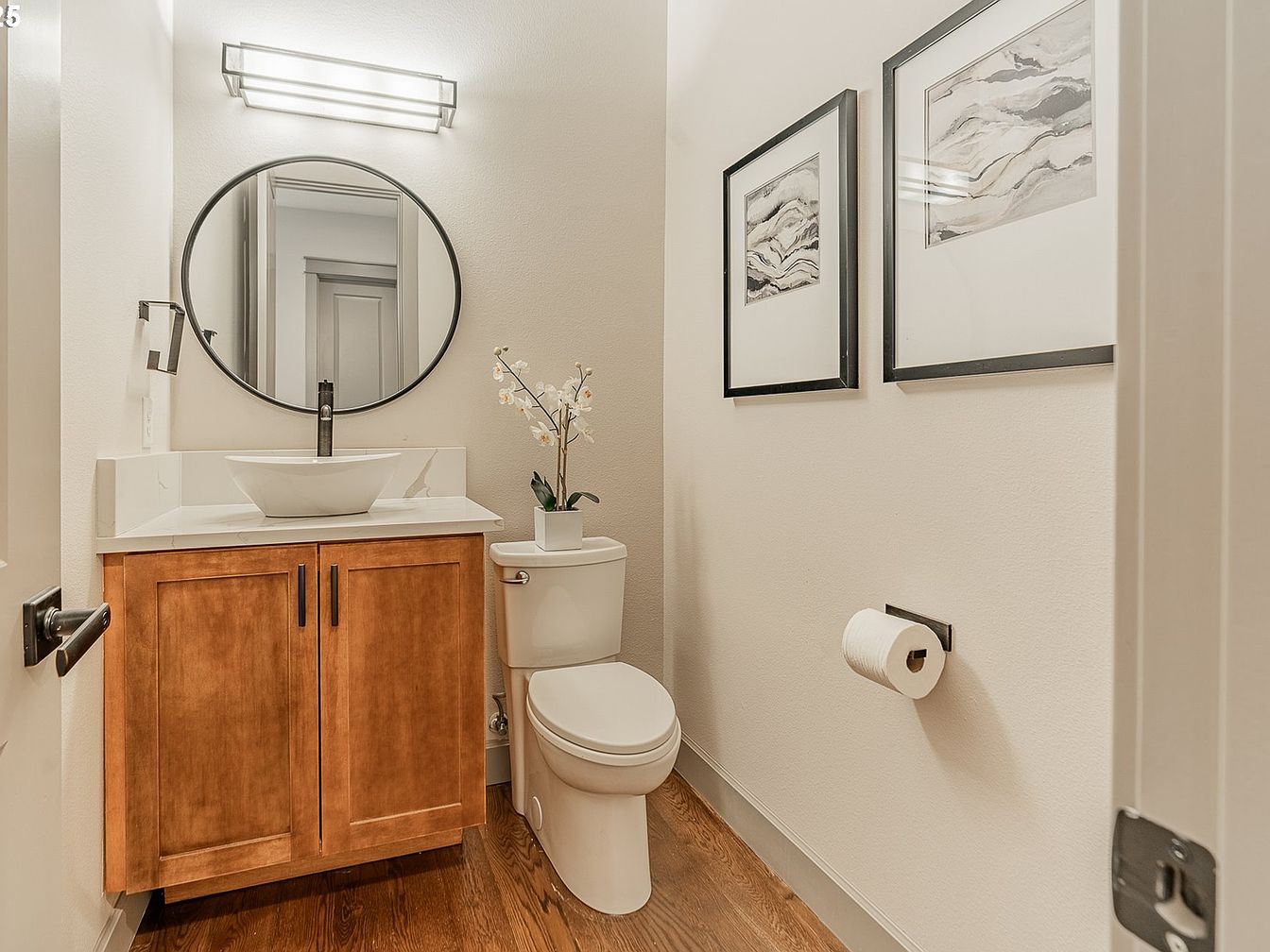 This compact powder room features a warm wood-toned vanity with a clean, white vessel sink and a sleek black faucet. Above the sink, a large round mirror adds depth and modern charm, illuminated by a contemporary rectangular light fixture. The crisp white walls create a bright and airy feel, complemented by natural wood flooring that adds warmth. Minimalist black-framed abstract art adorns the opposite wall, coordinating with the black hardware and fixtures to provide a cohesive and stylish aesthetic. A small potted plant atop the toilet adds a touch of freshness to the space.
