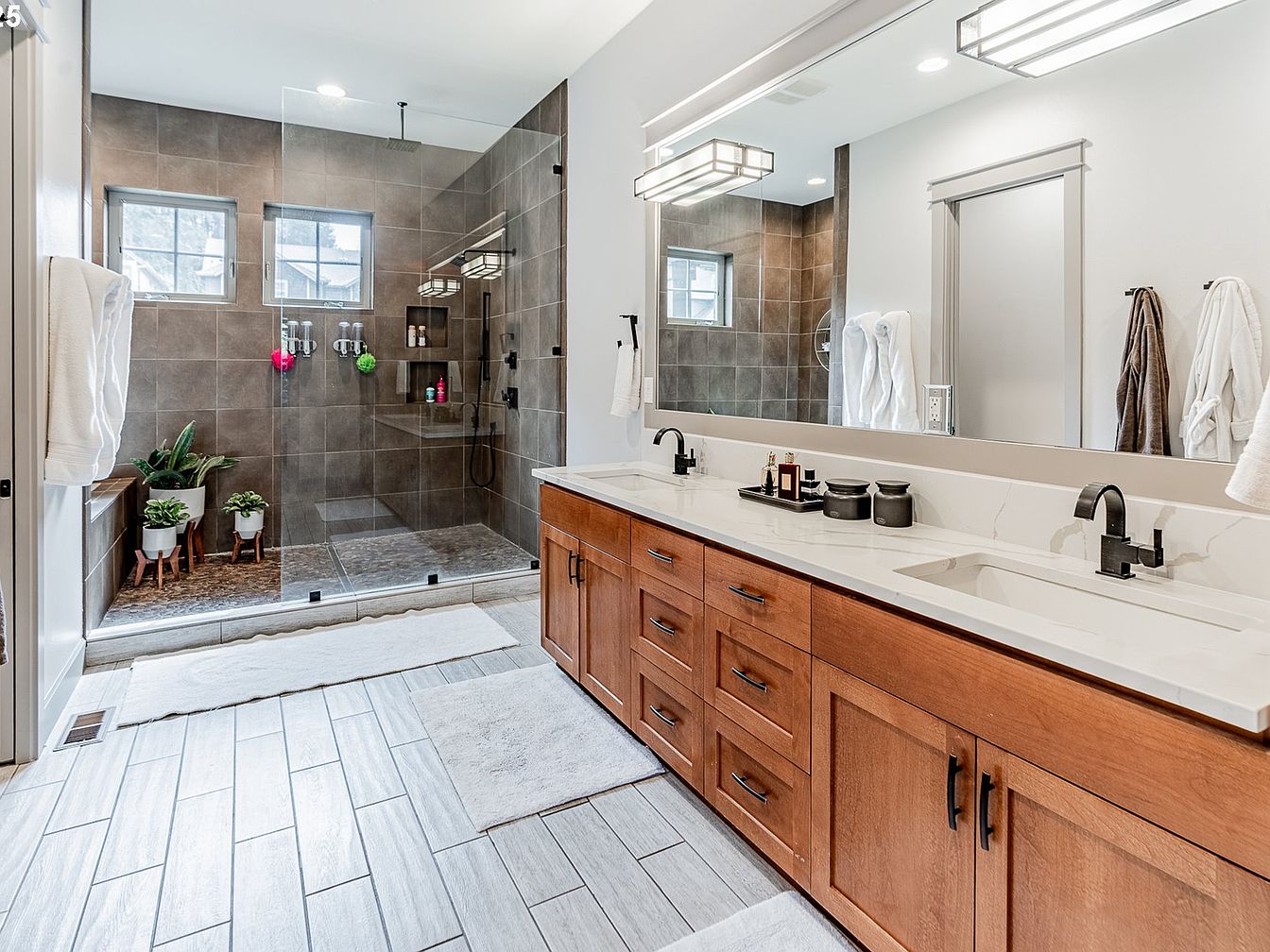 This bathroom features a spacious double vanity with warm wooden cabinetry and a sleek white countertop, complemented by matte black faucets. Above the vanity, a large mirror with integrated lighting enhances the sense of space and brightness. The walk-in shower is enclosed with clear glass panels and showcases large, dark gray tiles that add a modern, sophisticated texture. Two small windows bring in natural light, while built-in niches provide practical storage. The light gray wood-look tile flooring adds continuity and softness, paired with white rugs for comfort. Accent plants add freshness and a touch of nature.