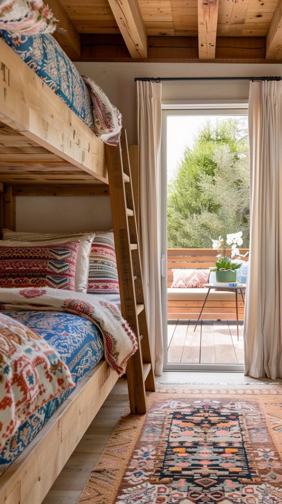This charming bunk bed setup features a rustic wooden frame that complements the exposed wooden ceiling beams, creating a warm and inviting atmosphere. The colorful, patterned bedding adds a vibrant touch, while the proximity to a sliding glass door ensures plenty of natural light. Perfect for a cabin or a home that embraces a cozy, natural aesthetic, this bunk bed design is both practical and aesthetically pleasing, providing a comfortable and stylish sleeping space.