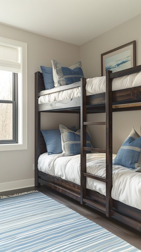 This bunk bed setup combines a sleek, dark wooden frame with soft blue and white bedding, creating a calm and serene atmosphere. The minimalist design is perfect for a modern home, providing both functionality and a touch of elegance. The large window allows natural light to enhance the room’s tranquil vibe, making it an ideal space for relaxation.
