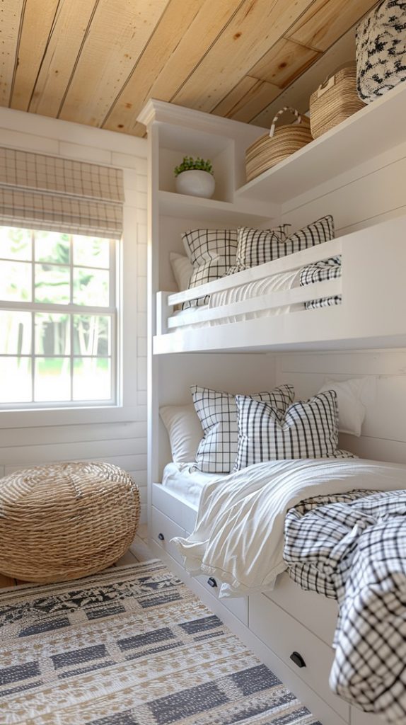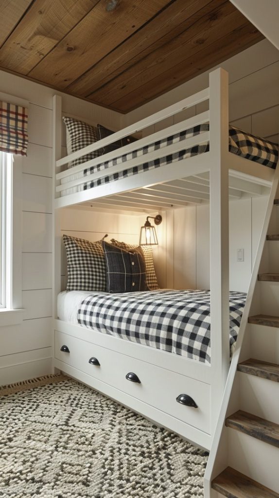 Featuring a timeless black and white color scheme, this bunk bed design exudes classic elegance. The checkered bedding and white bed frames create a clean and sophisticated look, ideal for any home seeking a stylish and enduring aesthetic.