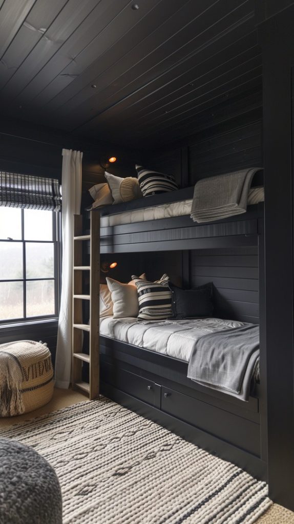 This bunk bed room features dark, moody tones with black bed frames and matching walls. The contrast with white bedding and natural light creates a sophisticated and dramatic look. Perfect for a modern, edgy home, this design balances elegance and comfort effortlessly.