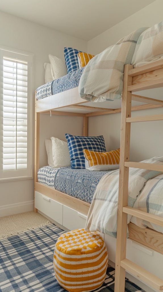 This lively bunk bed room is filled with vibrant colors and playful patterns. The light wood frames contrast beautifully with the blue and yellow plaid bedding. Soft, cozy pillows in complementary colors add to the cheerful ambiance, while the matching checkered rug and pouf bring a sense of cohesion to the space. Shuttered windows allow natural light to fill the room, enhancing the bright and inviting atmosphere.