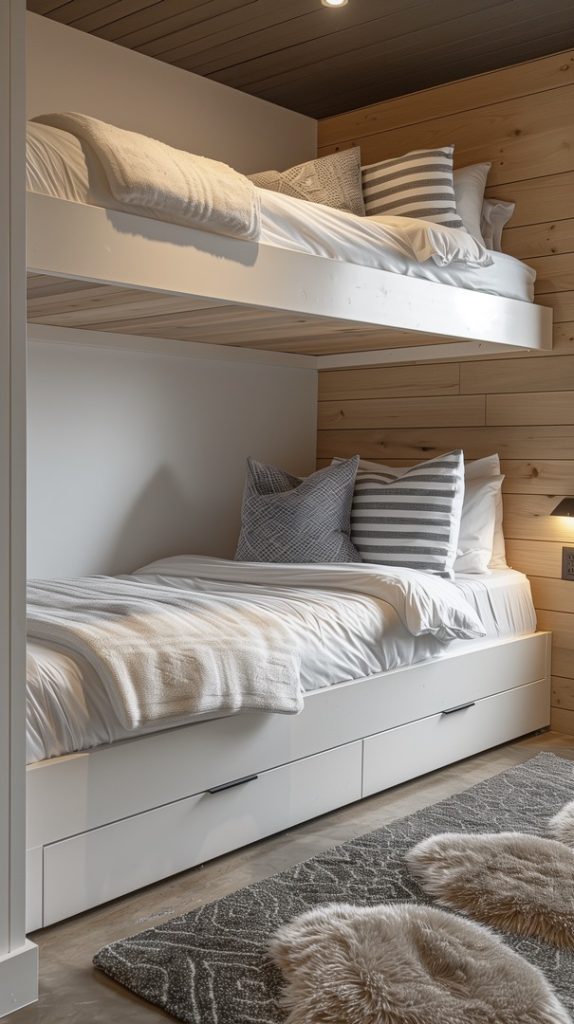 This bunk bed design strikes the perfect balance between rustic charm and elegant comfort. The wooden walls and bed frames create a warm, cabin-like feel, while the modern bedding and pillows add a touch of sophistication. Ideal for a mountain retreat or a cozy home, this setup offers both style and comfort.