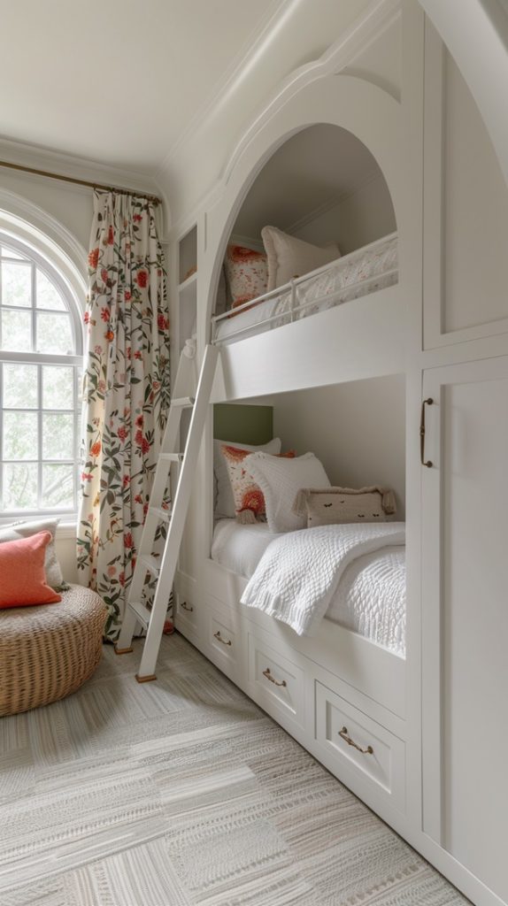 This elegant bunk room exudes sophistication and charm with its built-in bunk beds framed by arched panels and crisp white cabinetry. The bedding features soft, quilted textures in neutral tones, enhanced by subtle floral accents. A large arched window allows natural light to flood the room, highlighting the vibrant floral curtains that add a pop of color. The woven round chair provides a cozy reading nook, while the spacious drawers under the beds offer ample storage. The design balances classic elements with a touch of modern flair, creating a serene and stylish retreat.