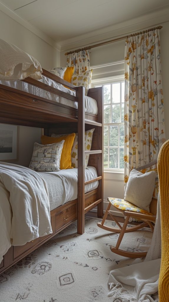 This bunk bed design exudes warmth and comfort with its rich wooden frame and bright yellow accents. The matching yellow cushions and curtains bring a sunny vibe to the room, making it an inviting space for children or guests. The large window allows natural light to flood in, enhancing the cheerful and welcoming ambiance of the room.