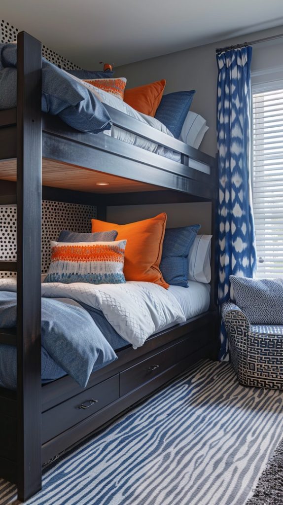 This dynamic bunk bed room is a visual feast with its bold navy and orange color scheme. The sturdy dark wood bunk beds are accented with a mix of denim blue and vibrant orange pillows, creating a lively contrast. The walls are decorated with a playful dot pattern, while the floor features a zebra-striped rug in shades of blue and white. A cozy reading chair by the window complements the look with a geometric pattern, and the room is tied together with matching ikat curtains. This space exudes energy and style, perfect for kids or teens.