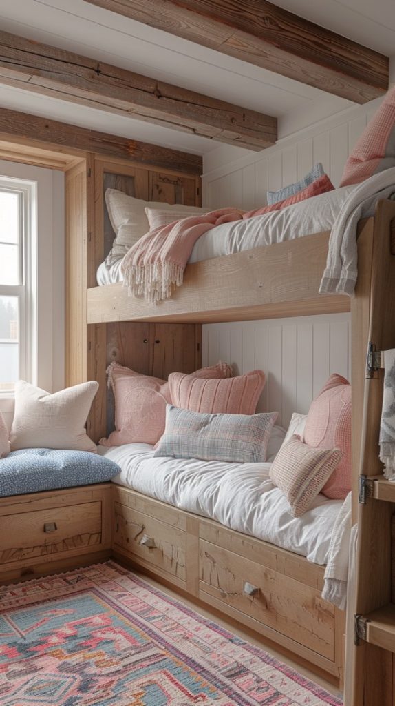 This charming bunk bed room blends rustic elements with soft pastel accents. The wooden bunk beds feature a natural finish, complemented by exposed beams and white shiplap walls. The bedding consists of plush pillows and cozy blankets in shades of pink, blue, and cream, creating a warm and inviting atmosphere. A built-in bench under the window is adorned with additional pillows, providing a perfect reading nook. The colorful patterned rug adds a vibrant touch, enhancing the overall homely feel of the space. This room is an ideal blend of comfort and rustic charm, perfect for a countryside home or cabin.