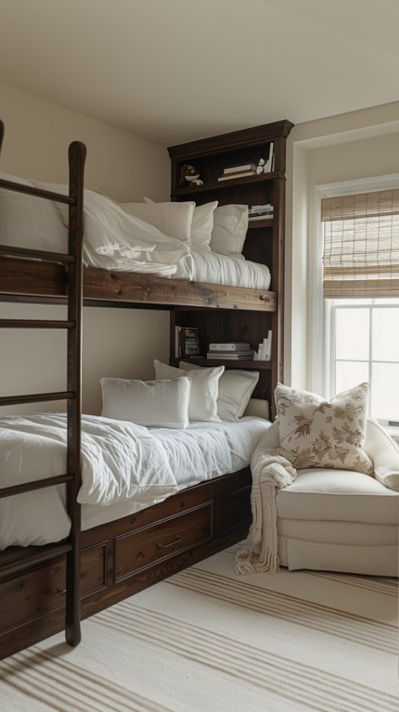 This timeless bunk bed design combines classic elements with modern comfort. The dark wood frames provide a rich, elegant look, while the white bedding and built-in bookshelf add functionality and coziness. Ideal for a guest room or a shared space, this setup offers a welcoming and comfortable environment.