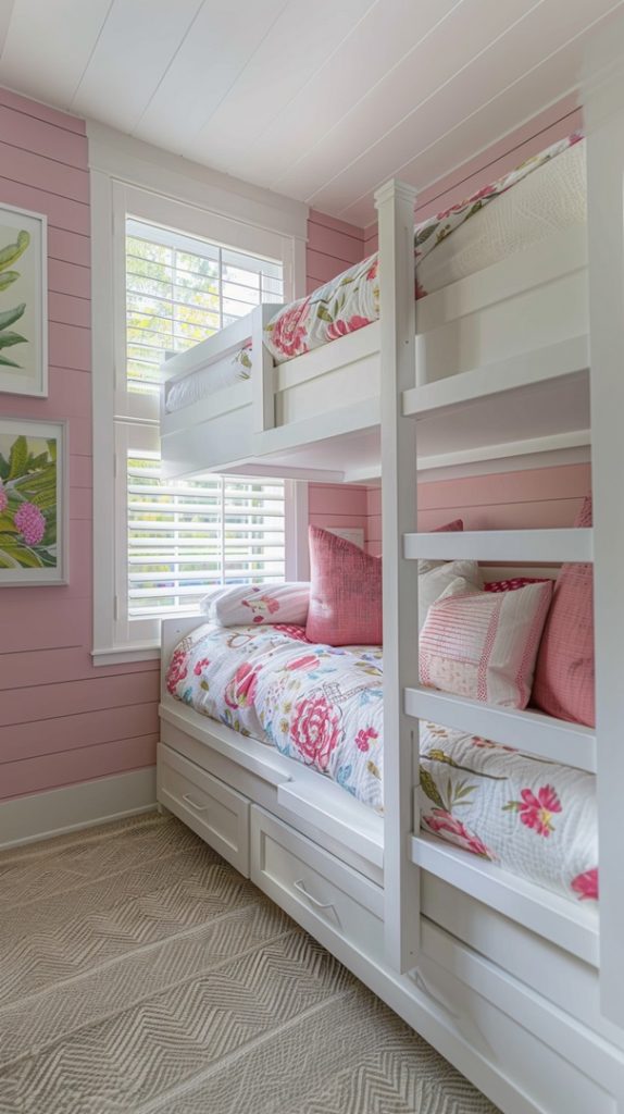 This delightful bunk bed setup features a floral theme that brings a touch of nature indoors. The white frames and pastel bedding create a light, airy feel, while the floral accents add a whimsical charm. Perfect for a girl’s room or a cheerful guest room, this design combines beauty with practicality.