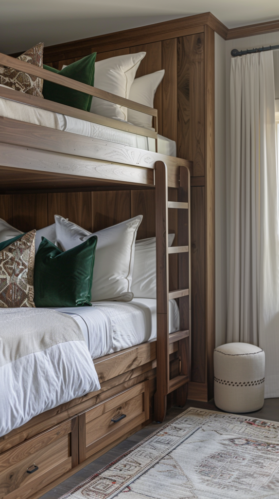 This elegant bunk room exudes sophistication and warmth with its rich wood tones and refined decor. The custom-built wooden bunk beds feature clean lines and ample storage drawers beneath, blending functionality with style. Luxurious white bedding is complemented by deep green and patterned throw pillows, adding a touch of opulence. A light-colored area rug with intricate designs adds a layer of comfort and visual interest. The room is finished with light, flowing curtains, creating a serene and inviting atmosphere. The combination of natural wood and plush textiles creates a cozy yet upscale retreat.