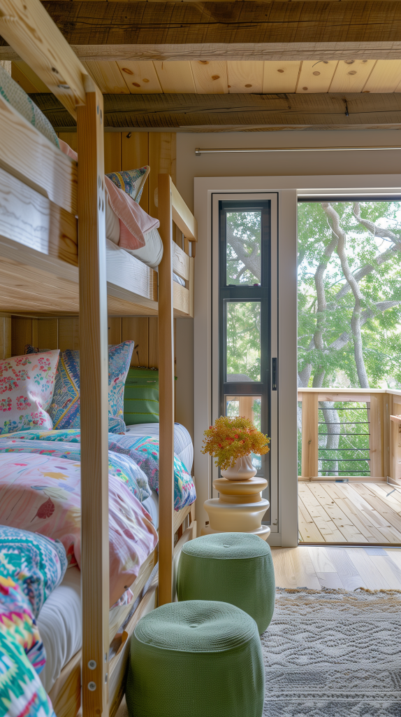 Surrounded by the beauty of nature, this vibrant bunk bed arrangement is perfect for a woodland retreat. The wooden frames and bright, colorful bedding create a lively yet harmonious environment. Ideal for a shared room, this setup ensures that each sleeper enjoys a cozy and cheerful atmosphere, enhanced by the serene outdoor view through the large glass door.