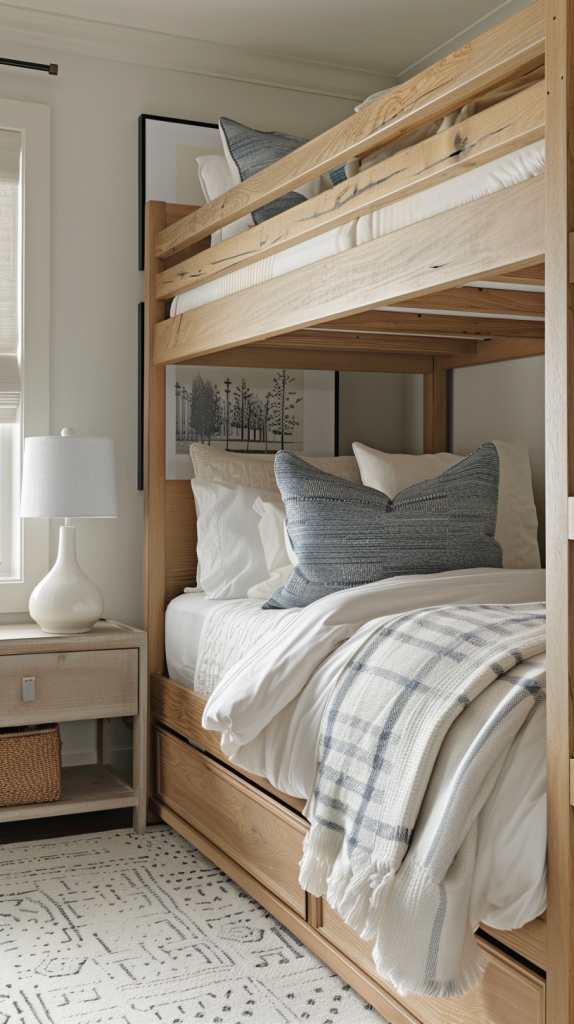 This cozy bunk room features a Scandinavian design with its clean lines, light wood furniture, and minimalist decor. The sturdy wooden bunk beds are dressed in crisp white linens, complemented by soft gray and blue accents. A plaid throw blanket adds warmth to the lower bunk, while a large blue decorative pillow enhances comfort. The room is bright and airy, thanks to a large window that lets in plenty of natural light. A simple nightstand with a woven basket and a sleek white lamp completes the look, along with a geometric patterned rug that adds a touch of subtle elegance to the space.