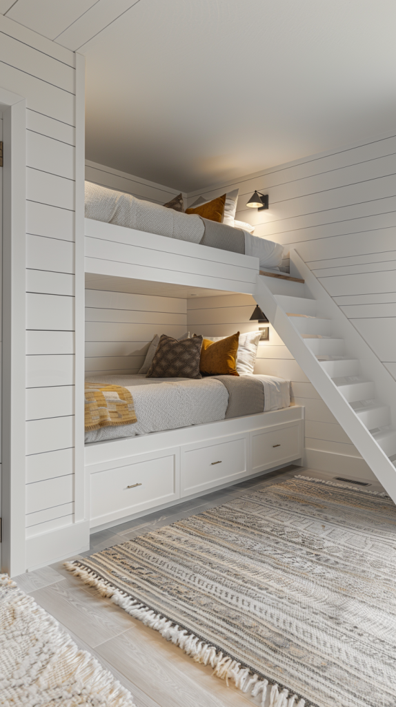 This stylish bunk room combines modern design with cozy functionality. The built-in bunk beds are framed with sleek white shiplap walls, creating a clean and contemporary look. Each bed features plush bedding with a mix of neutral and mustard-colored pillows, adding a pop of color and comfort. The lower bed includes convenient under-bed storage drawers, perfect for keeping the space tidy. A wide staircase leads to the upper bunk, providing easy access. The room is finished with soft, textured rugs that enhance the warmth and coziness of the space, making it an inviting retreat for adults and children alike.