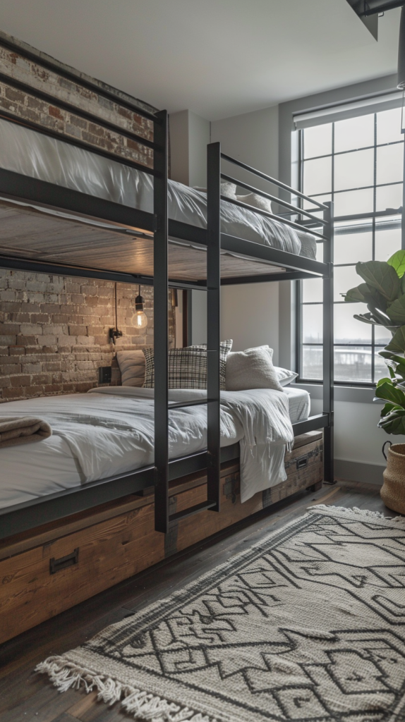 This industrial loft bunk room combines urban chic with modern comfort. Exposed brick walls and large factory-style windows set a rugged yet stylish tone. The bunk beds feature sturdy black metal frames and rustic wooden bases, creating a robust and practical sleeping arrangement. Soft, neutral bedding with plaid and solid-colored pillows adds a touch of warmth and coziness. An industrial pendant light with an exposed bulb enhances the room’s edgy aesthetic. A geometric patterned area rug and a large potted plant bring in softness and a hint of greenery, balancing the room’s industrial vibe with a touch of hominess.