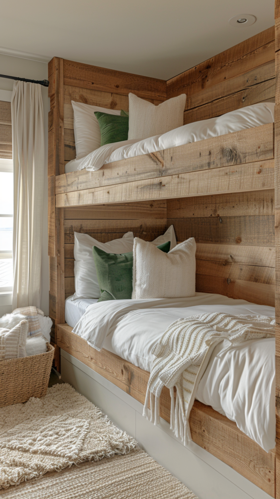 Combining earthy green tones with warm Wood accents, this bunk bed room offers a cozy and inviting atmosphere. soft, textured pillows add a touch of bohemian charm, making it a perfect choice for a relaxed and stylish space.