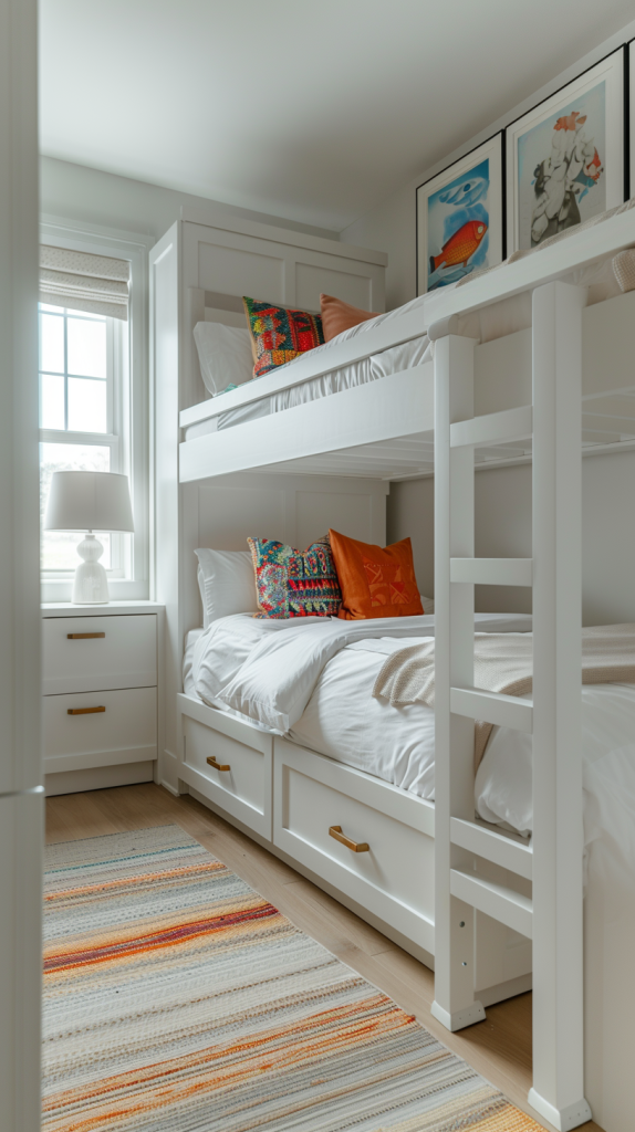 This playful bunk bed setup is perfect for a child’s room, featuring bright colors and fun, patterned bedding. The white frame keeps the design light and airy, while the built-in drawers provide extra storage. The cozy seating area and the cheerful decor make this an ideal space for both sleep and play, fostering a joyful and lively environment.