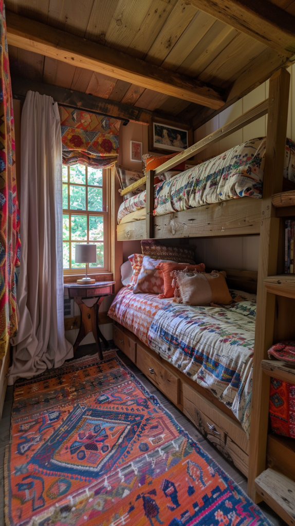 This cozy bunk room bursts with vibrant colors and eclectic patterns, creating a warm and inviting atmosphere. The wooden bunk beds are adorned with an array of colorful quilts and patterned pillows, each adding a unique touch of personality to the space. The walls are decorated with a mix of framed artwork and textiles, contributing to the room’s rich, layered look. The window is dressed with a colorful Roman shade, complementing the patchwork quilts on the beds. A rustic wooden side table holds a simple lamp, providing a spot for reading or relaxing. The highlight of the room is the vibrant, intricately patterned area rug that covers the floor, tying together the various hues and patterns in the room. This eclectic space is perfect for those who appreciate a lively and artistic environment, offering a cozy retreat filled with charm and character.