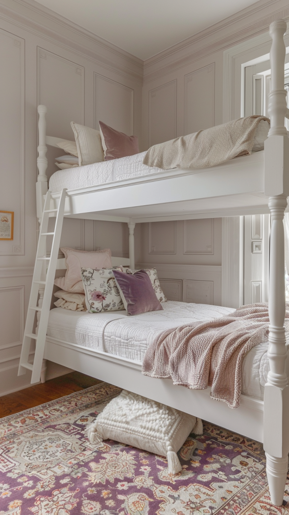 This charming bunk room is designed with a vintage-inspired aesthetic, featuring elegant white bunk beds with beautifully turned posts that add a touch of classic charm. The soft pastel palette of the room is complemented by delicate wall paneling that enhances the vintage feel. Cozy bedding in shades of white and blush is adorned with plush pillows in muted floral prints and velvet textures. A knitted throw blanket casually draped over the lower bunk adds warmth and comfort. The room is further enhanced by a richly patterned area rug in shades of purple and cream, which adds a pop of color and ties the vintage theme together. This space combines timeless design elements with cozy touches, creating a serene and inviting retreat.