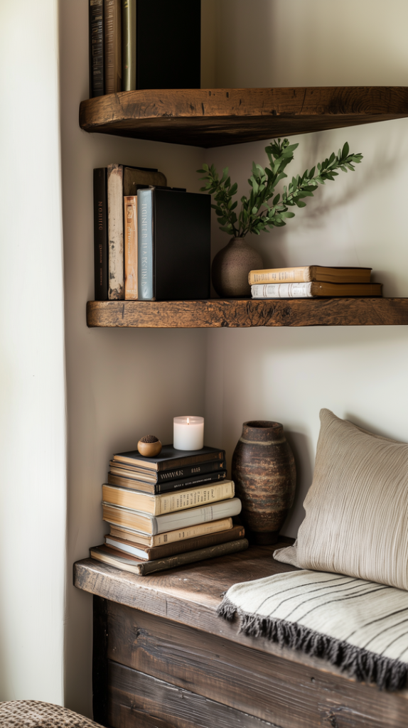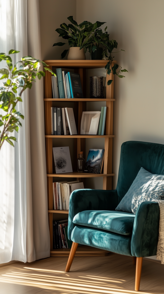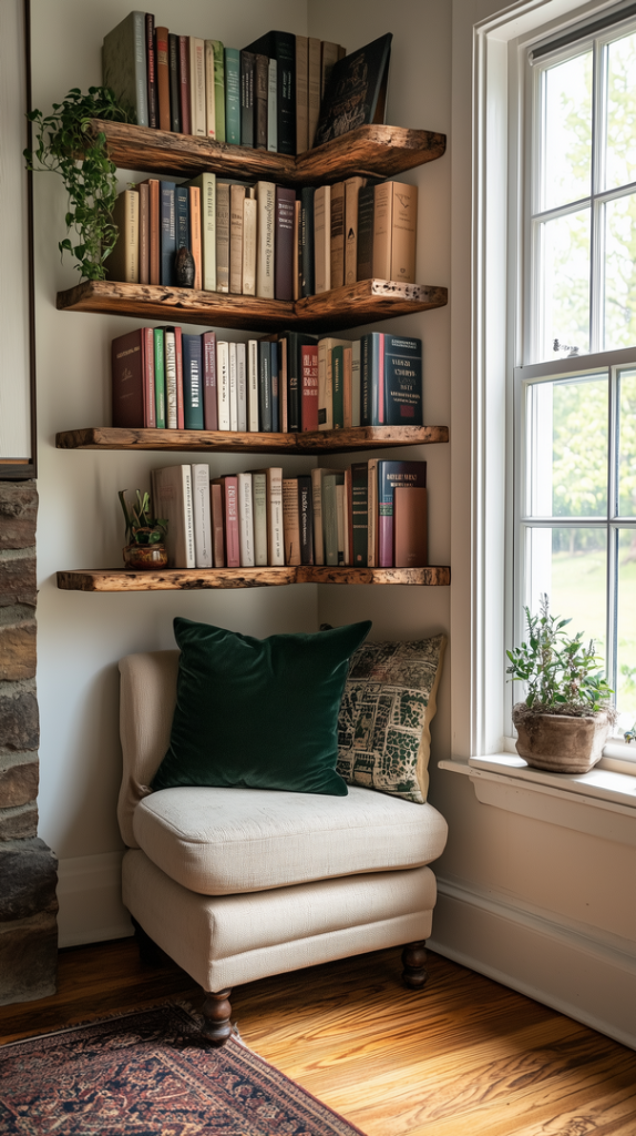 This corner reading nook makes clever use of space with floating wooden shelves that climb the wall. The cozy armchair beneath offers a perfect spot to sit back and relax, while the shelves above store an array of books and decorative items. The combination of soft natural light and wooden tones makes the area feel inviting and serene, perfect for small bedrooms or living rooms where space is limited but comfort is a priority.
