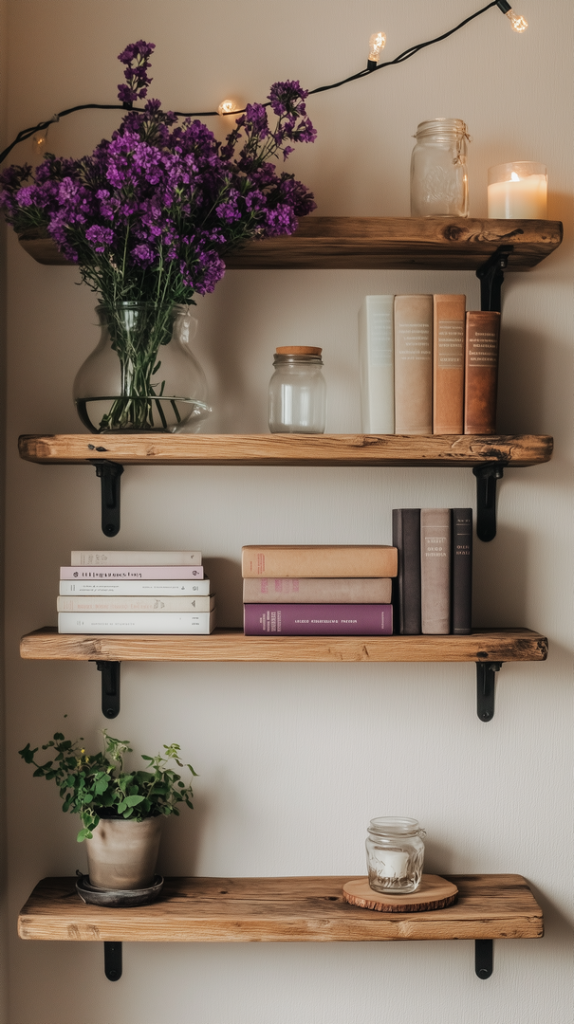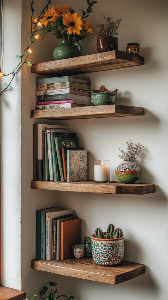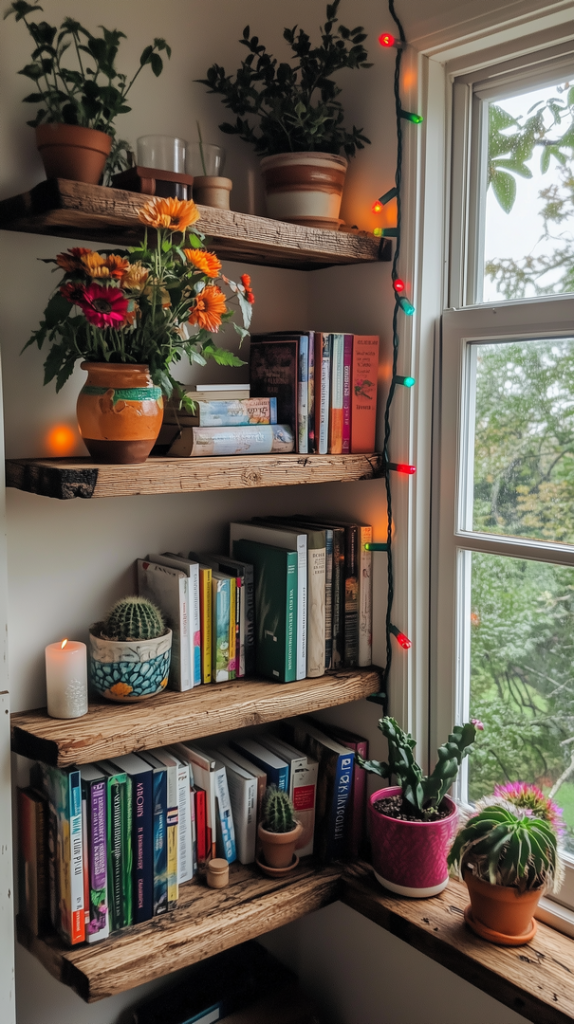 These boho-style floating shelves provide a creative and space-saving solution for displaying books in a small room. Perfect for a hallway or cozy bedroom corner, the three wooden shelves are artfully arranged with books, candles, and vases of dried flowers, offering a balance of function and décor. Fairy lights enhance the soft ambiance, making this a delightful, space-efficient way to store and display your book collection while maintaining a stylish aesthetic.