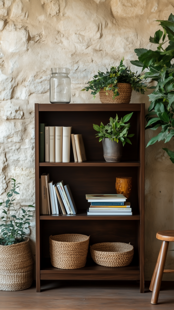 This rustic wooden wall shelf makes the most of vertical space, making it perfect for small living rooms or bedrooms. Its natural wood grain gives off a warm, rustic feel, and the tiered shelves are perfect for storing books, plants, and decorative items. With carefully arranged plants and books, this wall-mounted bookshelf adds both charm and function. A few pieces of vintage décor elevate the style, making this shelving solution both practical and beautiful for a compact area.