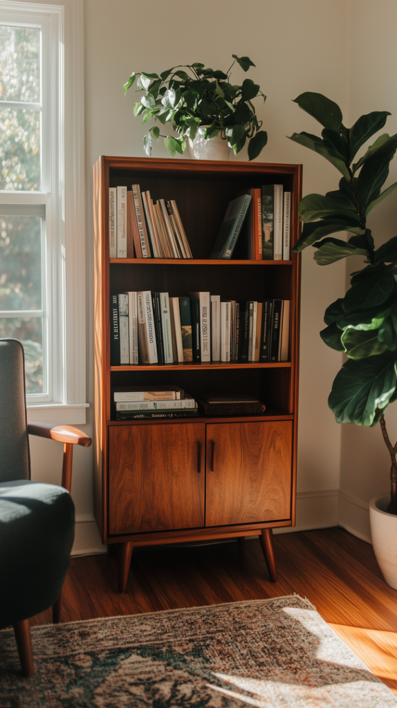 This mid-century modern bookshelf is designed with small spaces in mind. The sleek wooden frame features compact shelves that allow for book storage and display without taking up too much room. The simple lines and dark wood finish make it a versatile addition to any home, bringing a classic yet modern touch to bedrooms, living areas, or home offices. Its modest height ensures it doesn’t overwhelm a small space while still providing ample room for books and décor.