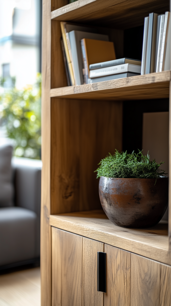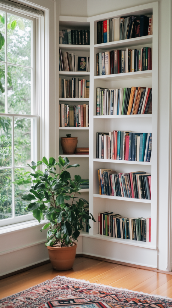 Tucked by a window, this cozy corner bookshelf makes the most of a small area with ample natural light. The arrangement of books, potted plants, and small decorative items on the deep shelves creates a welcoming reading corner. The natural wood tones and the greenery complement each other perfectly, bringing life to the space. Ideal for apartments or rooms with limited floor area, this design turns a tight space into a functional and charming mini-library.