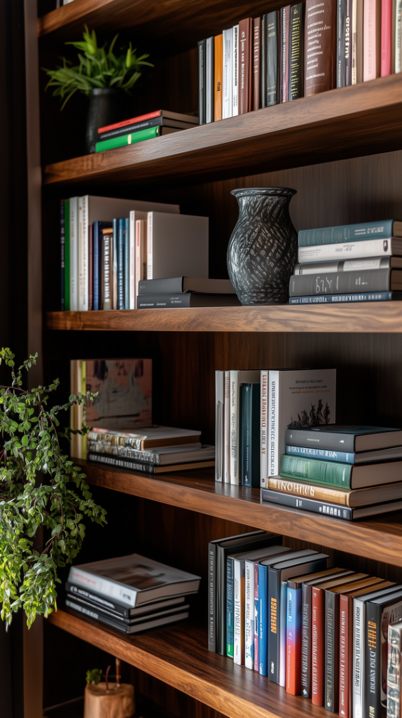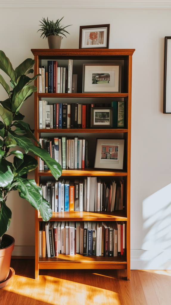 This bookshelf offers deep shelves for holding a substantial collection of books and personal items. It’s an excellent option for small spaces where storage is a premium. Books are stacked neatly alongside personal décor, with plush toys or photos adding a cozy and personal feel. The darker wood tones give it a solid, grounding presence in a room, making it perfect for a study or bedroom where comfort and functionality meet.