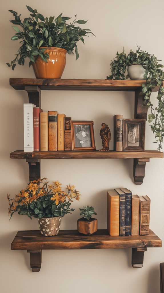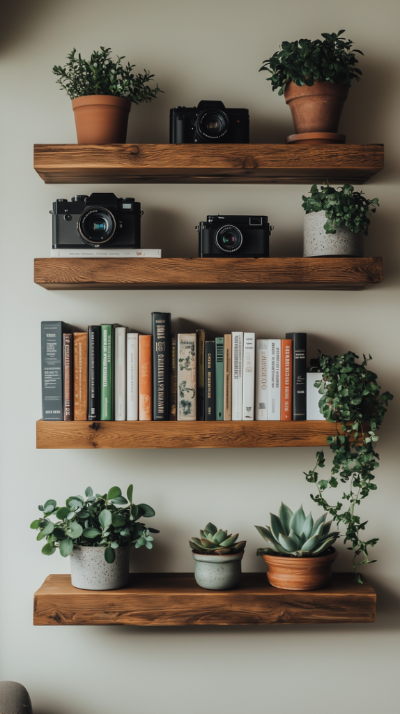 These rustic floating shelves provide the perfect blend of style and function, ideal for small spaces. With a natural wood finish, the shelves hold books, cameras, and potted plants, creating a cozy, visually pleasing display. The arrangement adds both greenery and texture to a blank wall, making the most of vertical space without crowding the room. The organic shapes and warm tones make these shelves a great addition to any living area, bedroom, or hallway in need of space-saving solutions.