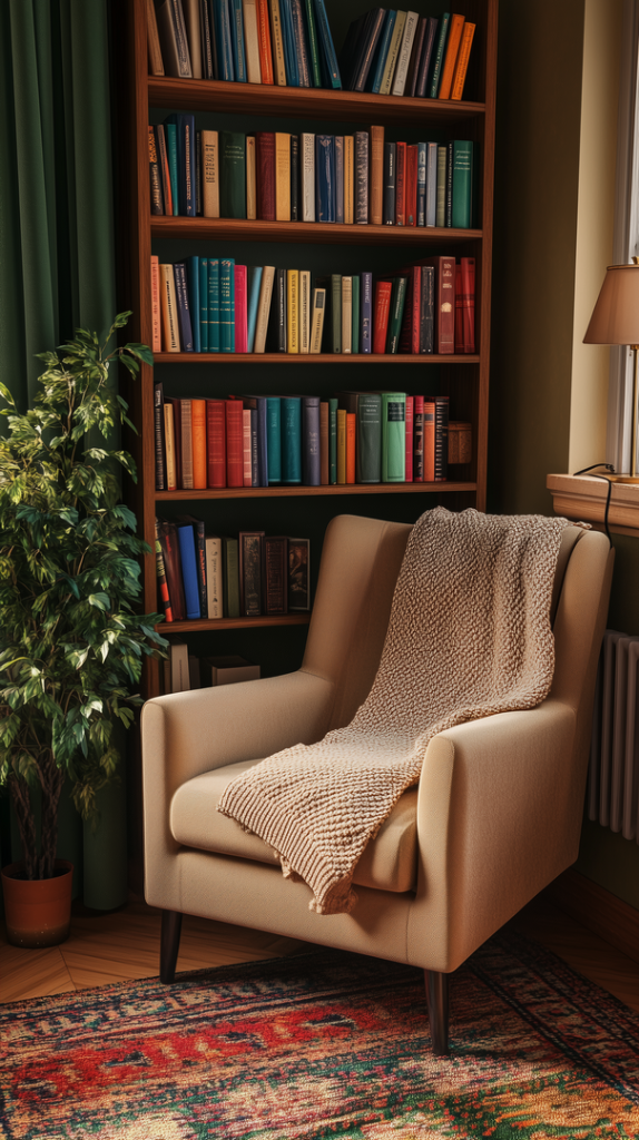 This cozy reading nook features a classic wooden bookshelf filled with books and surrounded by comfortable seating. The rich wood tones and floor-to-ceiling design make the most of vertical space, while the armchair and blanket provide an inviting spot to relax. Ideal for a small living room or bedroom, this setup creates a personal library feel in any compact area, combining comfort and function in one elegant design.