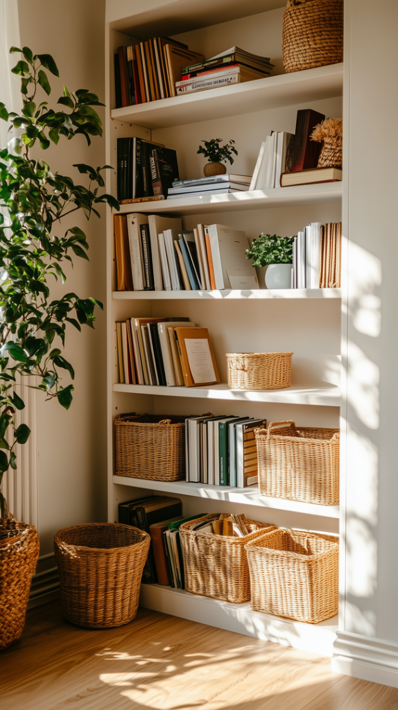 This built-in shelving unit is perfect for maximizing storage in small spaces. The white shelves create a clean, minimalist look, while woven baskets on the lower shelves add warmth and texture. With plenty of space for books, décor, and baskets to hide clutter, this design is both practical and stylish. The bright natural light enhances the space, making it a perfect solution for hallways, living rooms, or bedrooms that need extra storage without sacrificing aesthetics.