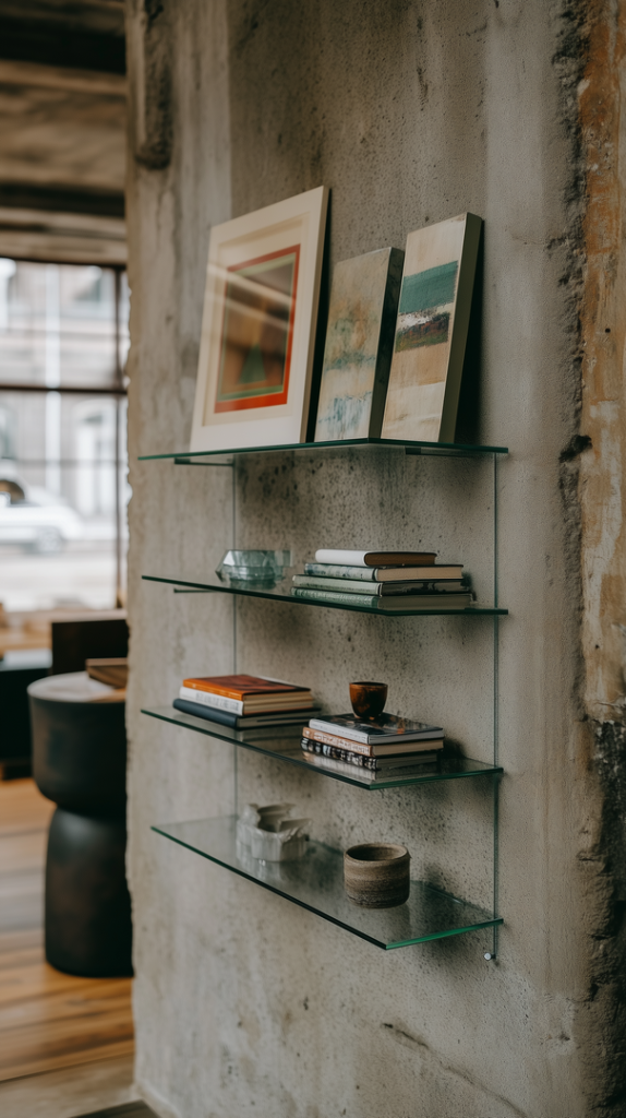 These minimalist glass wall shelves offer a sleek and modern solution for displaying books and art in small spaces. The transparent shelves create a floating effect, making the wall appear less cluttered while providing ample room for your favorite reads and décor. This is a great option for small apartments or industrial-style spaces where you want to maintain an open, airy feel without compromising on storage.