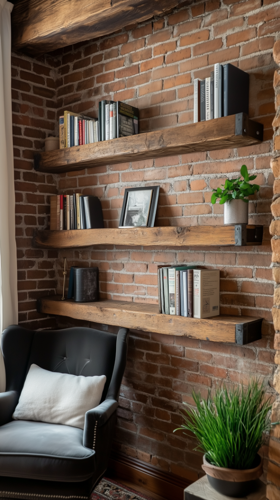 These industrial floating shelves are set against a rustic brick backdrop, creating a stunning visual contrast. The open shelving allows for the display of books, photos, and small décor items, making this a perfect fit for small lofts or urban apartments. The wood and metal elements bring warmth and a modern edge to the space, while the exposed brick adds character. This shelf arrangement is both functional and stylish, ideal for those looking to make a statement in a small area.