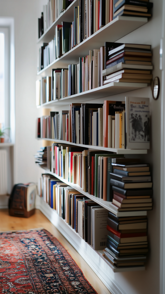 These floor-to-ceiling bookshelves are a brilliant way to maximize storage in narrow spaces. The vertical design provides ample space for storing a large book collection, while also giving the room a sophisticated, library-like atmosphere. Perfect for hallways or living rooms, this design makes the most of every inch, creating an organized and visually stunning wall of books that adds both function and style to any small space.