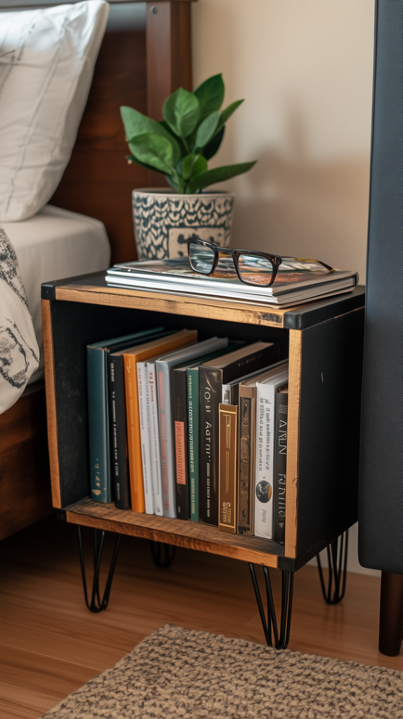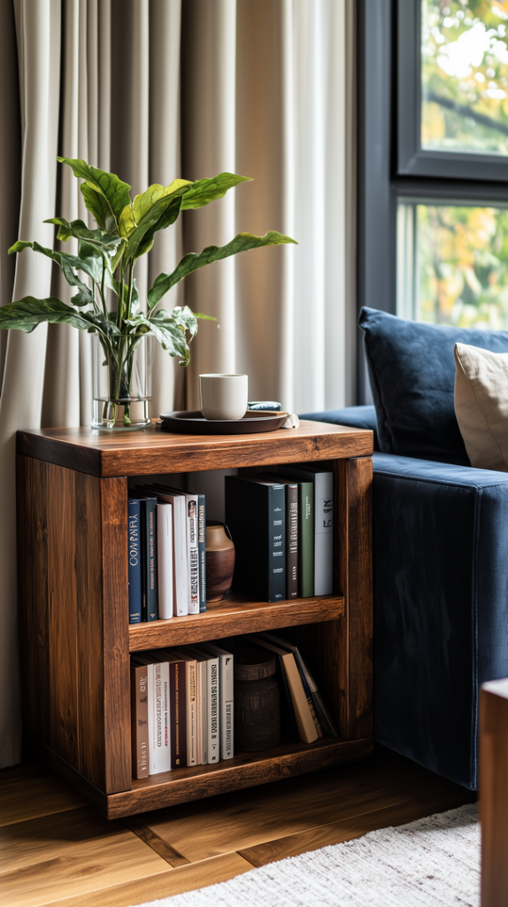 This compact side table doubles as a bookshelf, providing both storage and surface area in a small space. The wooden structure holds several books while the top offers room for plants or decorative items. This design is ideal for a bedroom or living room where you need a bedside or couch-side table with added functionality. Its simple yet elegant design integrates seamlessly into any décor, making it both practical and aesthetically pleasing.