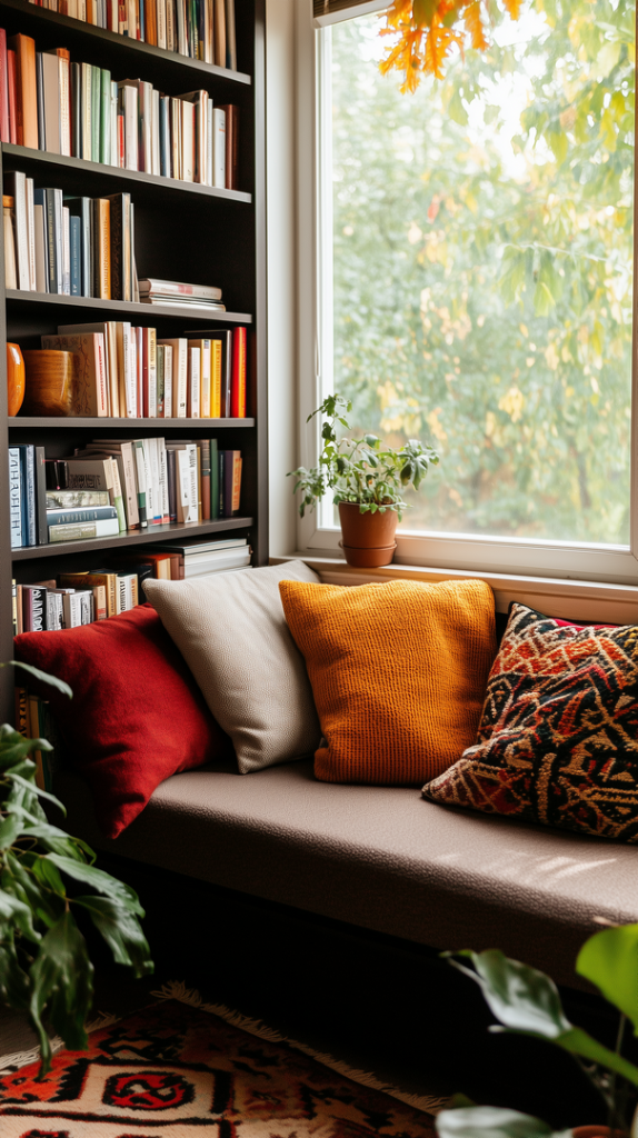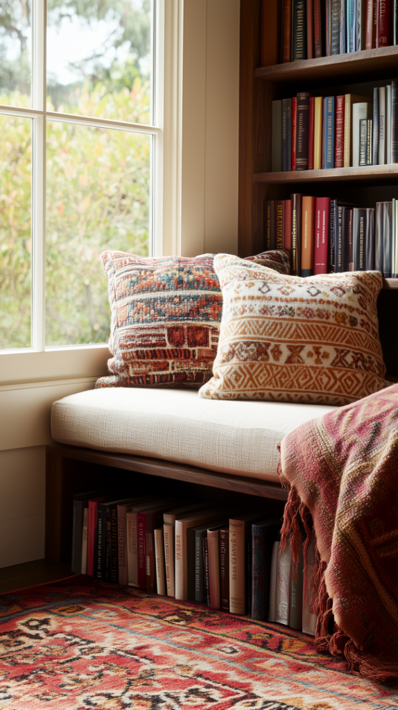 This cozy window seat is flanked by towering bookshelves, creating the ultimate reading nook. The built-in shelves offer plenty of space for books and décor, while the cushioned seat provides a comfortable spot to enjoy your favorite reads. With large windows bringing in natural light, this is the perfect corner for curling up with a book. The combination of seating and storage makes it ideal for small rooms that need to maximize every inch of space.