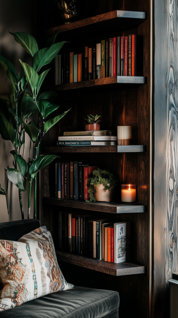 These dark wood bookshelves are illuminated by soft accent lighting, creating a warm, inviting atmosphere. The open shelving design allows for easy access to books while leaving space for decorative items like plants or candles. The rich wood tones paired with the lighting make the space feel luxurious yet cozy, perfect for small spaces where you want to create a relaxing, elegant ambiance.