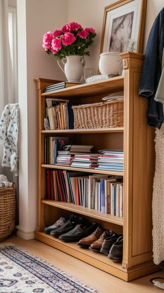This versatile wooden bookshelf combines traditional elegance with modern functionality, making it an ideal solution for small spaces. The warm wood tones bring a cozy, timeless appeal, while the bottom shelf cleverly doubles as a shoe rack, maximizing space efficiency. The bookshelf itself is adorned with a beautiful display of colorful books, woven baskets, and decorative elements, offering both practicality and style. This design works perfectly in entryways or bedrooms, offering a chic way to keep books organized while also managing footwear neatly below.