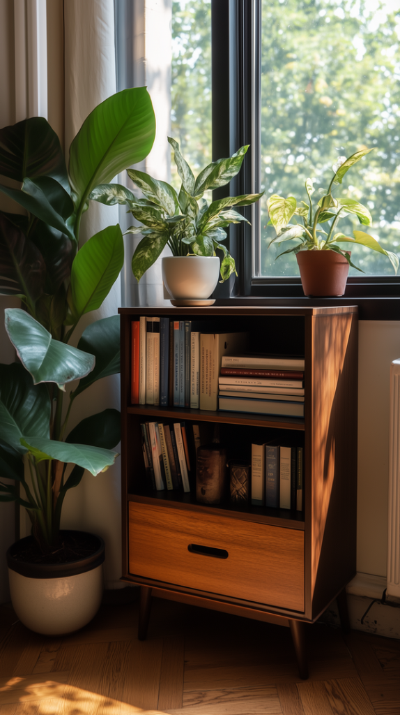 This compact bookshelf maximizes space by placing it near a window, allowing for natural light to illuminate the reading area. Its minimalistic design features two upper shelves and a drawer, making it a functional yet aesthetically pleasing piece. Books, potted plants, and small décor items can easily fit on this piece, while the drawer provides extra storage. This bookshelf blends into modern or minimalist spaces, creating a cozy, well-organized corner that feels airy and fresh.