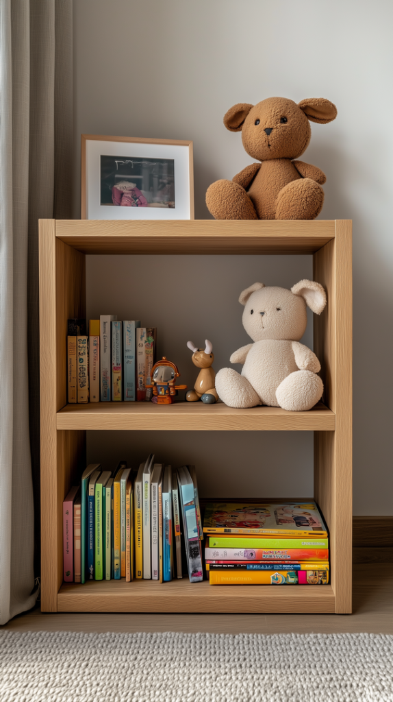 This simple, two-tier bookshelf is ideal for organizing children’s books and toys in a small space. With a minimalistic square design, it holds a collection of books with room for plush toys or decorative pieces on top. Its neutral wood tones make it a versatile addition to any children’s bedroom or playroom. Easy to access for little ones, this shelf provides a practical and charming storage solution for books while encouraging a love for reading.