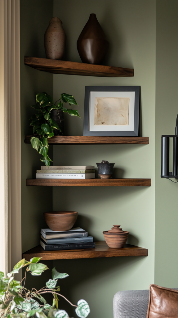 This set of corner shelves is a smart solution for utilizing unused spaces in the home. Mounted neatly in a corner, these shelves offer ample storage for books, pottery, and décor without intruding on the room’s floor space. The varied arrangement of items, including plants and small art pieces, adds a personal touch to the design. Perfect for compact living areas, the wooden shelves bring warmth and organization to the space, making the corner both functional and aesthetically pleasing.