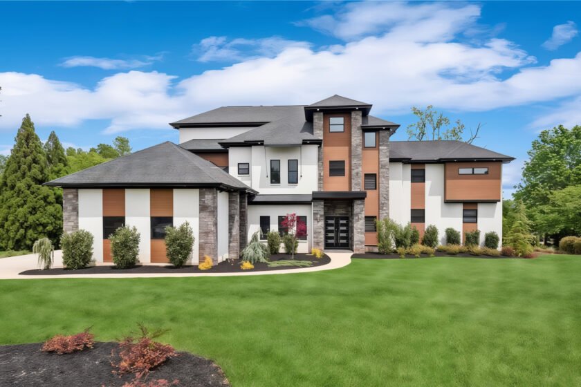 The front of this contemporary home showcases a unique blend of stone, wood, and white exterior finishes.