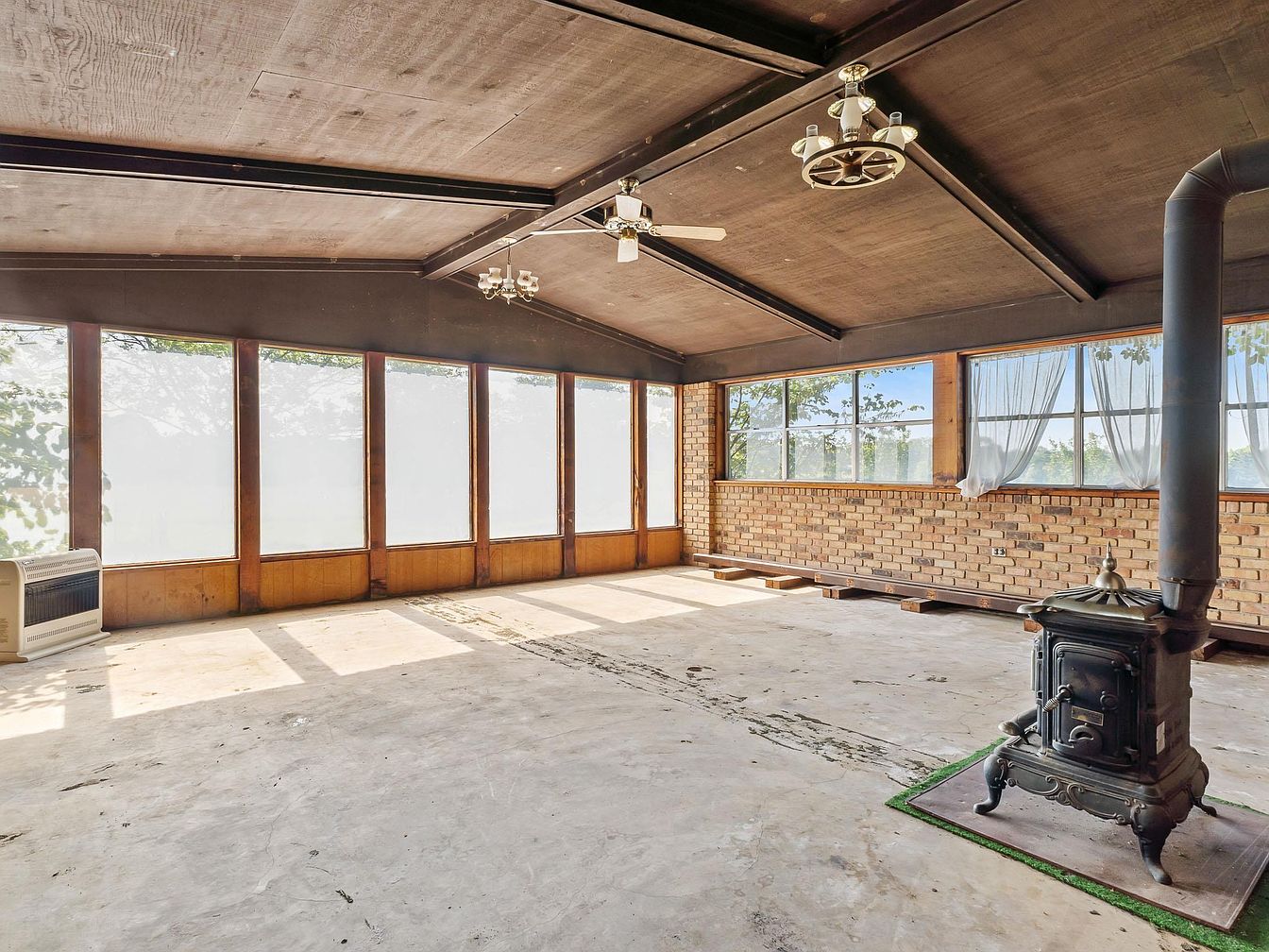 This spacious sunroom features a rustic aesthetic with exposed brick walls and a dark, wood-paneled ceiling accented by black beams. Large windows on two adjoining walls flood the space with natural light while sheer curtains offer a soft touch to the otherwise industrial feel. The concrete floor grounds the room, contrasting with the warm wood paneling below the windows. A vintage-style cast iron wood stove stands prominently for heating, paired with a modern wall heater. Unique ceiling fixtures, including a ceiling fan and chandelier-style lights, add character and warmth to the airy layout.